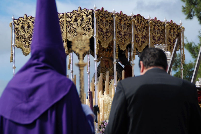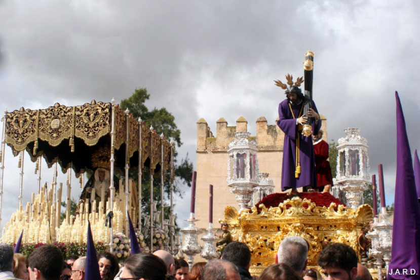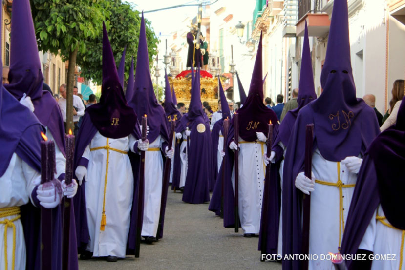 Al nacer el Viernes Santo la Hermandad sale a la calle, la noche se hace luz, la luna, que entre nubes renace, quiere ir de penitente. El silencio chasquea fervor y pasión. La vereda hacia Mayrena es corta, al entrar por la antigua puerta de Sevilla el amor se hace dardo.