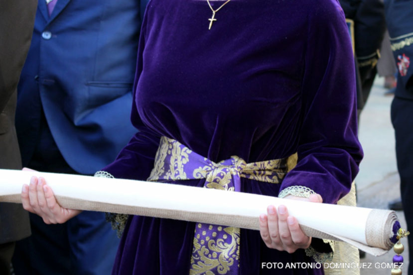 «La Verónica». Mujer vestida de hebrea que limpia el rostro de Jesús. Este rito supone el momento más emotivo dentro del recorrido procesional de nuestra Cofradía. El Viernes Santo, tras el “Encuentro” tiene lugar el “Sermón del Calvario”, dentro del cual se escenifica este rito.