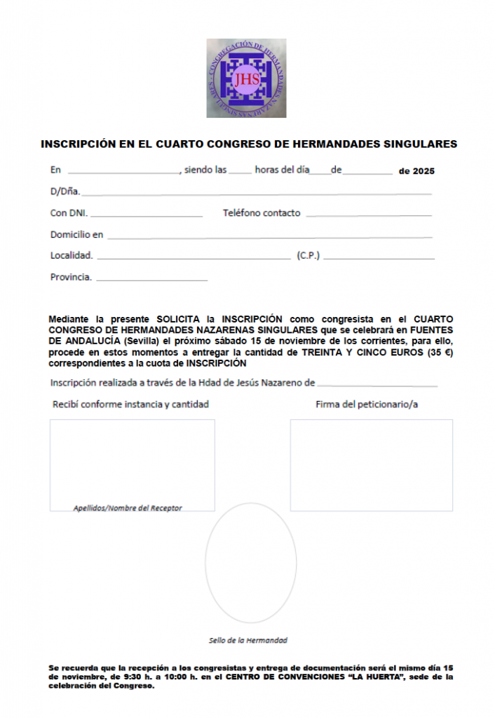 Ya está abierto el plazo de inscripción de congresistas, hasta el día 3 de noviembre, para el Congreso de FUENTES DE ANDALUCÍA, que se harán de acuerdo con el modelo de formulario de inscripción que os remito y a través de las Hermandades de la Congregación.